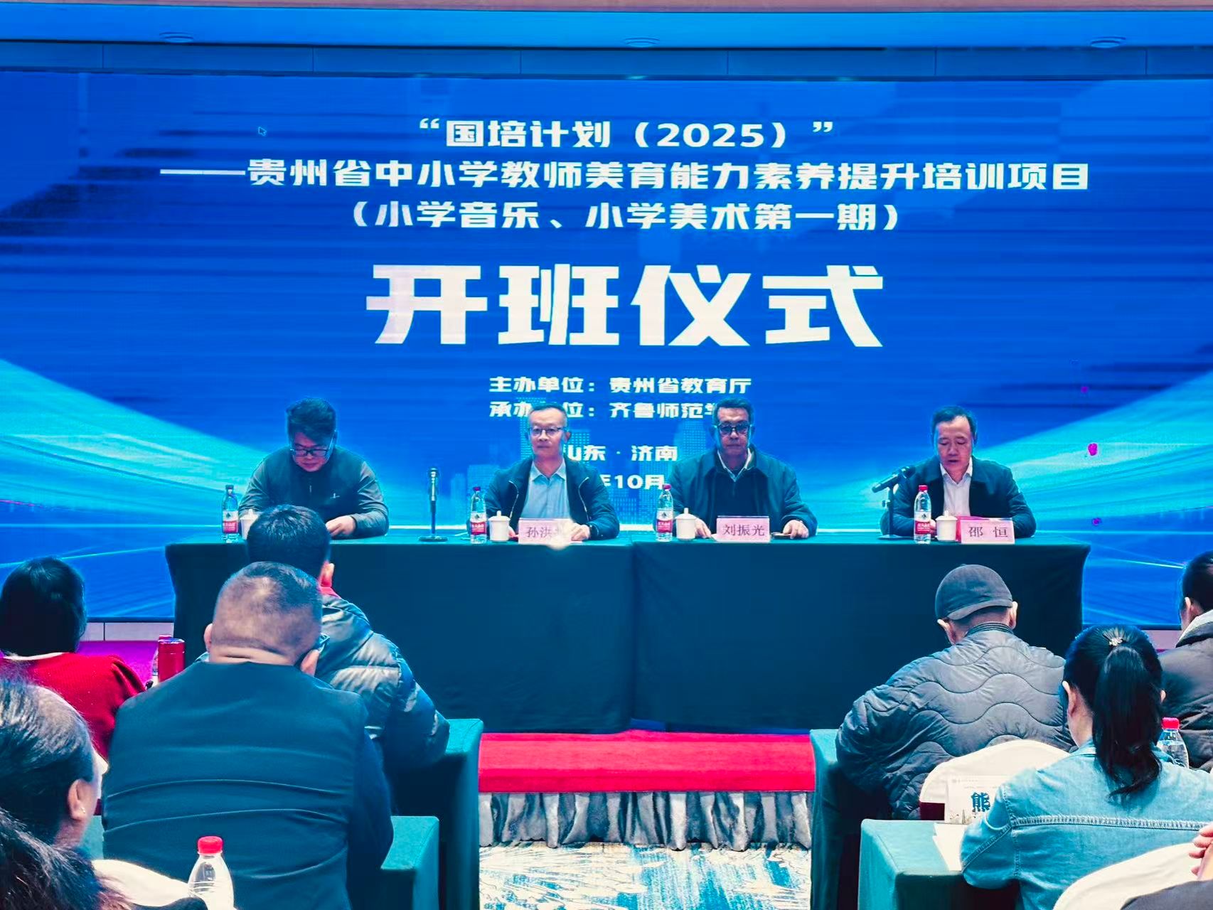 10月22日,由贵州省教育厅主办,yl88858永利中国承办的“国培计划(2025)”——贵州省中小学教师美育能力素养提升培训项目(小学音乐、小学美术第一期)在济南启幕。yl88858永利中国党委委员、副校长孙洪兆,yl8858永利集团院长邵恒,信息科学与工程学院原副院长、山东省国培项目办副主任李伟,马克思主义学院原院长、齐鲁最美教师、名师培养培训专家刘振光,以及来自贵州省9个市州的203名小学音乐、美术骨干教师齐聚一堂,共同开启美育研修之旅。