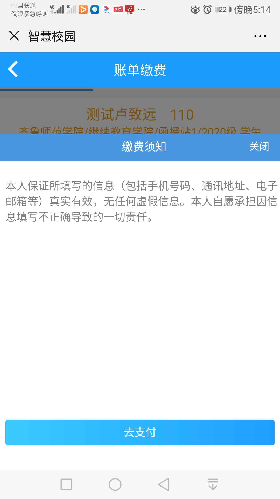 登录后务必仔细核对姓名、专业、身份证号、账单金额、账单说明等信息。