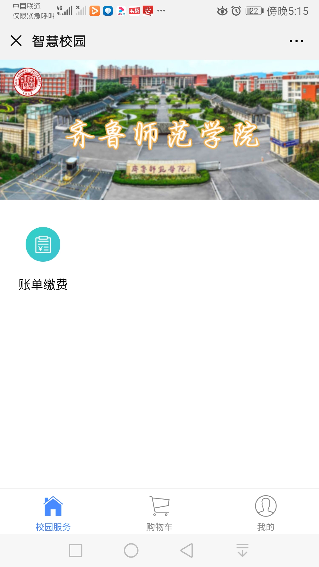 第二步:进入公众号后点击下面“学生通道”中“智慧缴费”选项进入缴费平台页面。